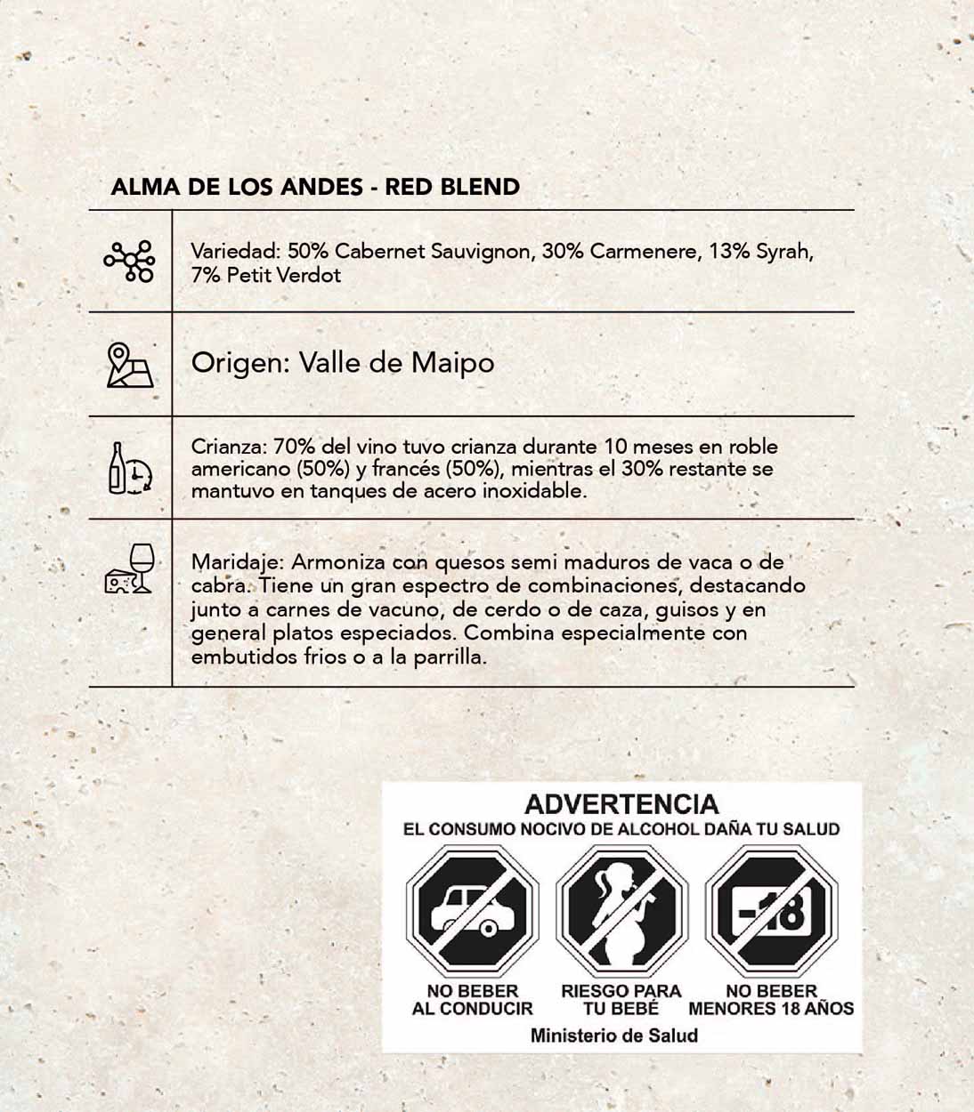 Este ensamblaje de 50% Cabernet Sauvignon, 30% Carmenere, 13% Syrah, 7% Petit Verdot. Color rojo rubí intenso. Intensa nariz de frutos negros y rojos, dulce de mora y claras notas de especias. Abre con abundantes sabores frutales de moras y berries rojos. Sus taninos suaves y buena estructura se equilibran perfectamente. Es un vino de cuerpo equilibrado y final persistente que deja notas finales de especias, chocolate y vainilla. Armoniza con quesos semi maduros de vaca o de cabra. Tiene un gran espectro de combinaciones, destacando junto a carnes de vacuno, de cerdo o de caza, guisos y en general platos especiados. Combina especialmente con embutidos fríos o a la parrilla.